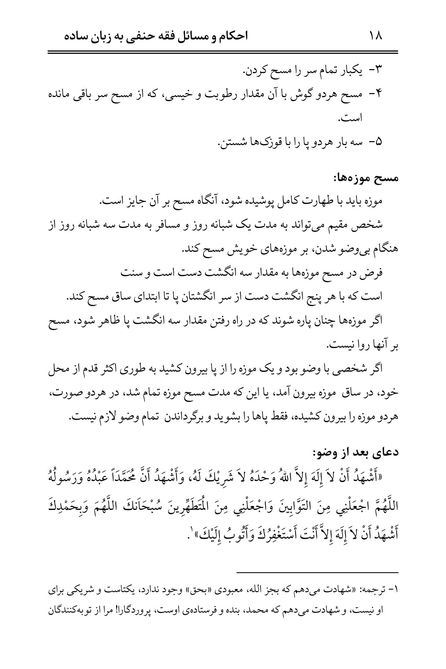 АҲКОМ ВА МАСОИЛИ ФИҚҲИ ҲАНАФӢ БО ЗАБОНИ СОДДА بسم الله الرحمن الرحيم الحمد لله رب العالمين. والصلاة والسلام على رسول الله محمد وعلى آله وصحبه أجمعين. أما بعد... КИТОБИ ТАҲОРАТ Вузӯ Фарзҳои вузӯ: Дар вузӯ чаҳор амал (чиз, рафтор) фарз аст: 1. Шустани сурат (рӯй) дар тӯл (дарозӣ) аз болои пешонӣ (ибтидои маҳалли рӯидани мӯи сар) то зери чона ва занахдон (зени манаҳ) ва дар арз (аз рӯи бараш) то ҳарду гӯш. Ёдоварӣ: Чунончи риши касе анбӯҳ ва ганҷон (зиёд) бошад, расонидани об дар буни (решаи) мӯҳои риш, лозим нест. 2. Шустани ҳарду даст то оринҷҳо. 3. Масҳи чаҳоряки сар. 4. Шустани ҳарду по то шитолангҳо (устухонҳои пошнаи по, қузак, буҷилак). Чунончи аз чаҳор узви мазкур ба андозаи як нохун ё камтар аз он ҳам хушк бимонад, вузӯ саҳеҳ нест.